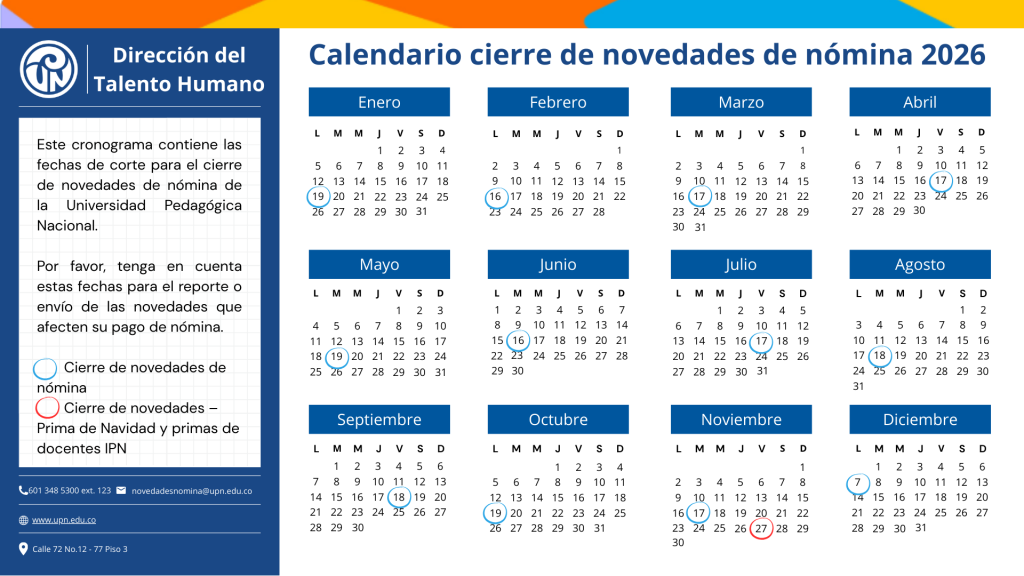 La Dirección del Talento Humano pone a disposición el cronograma de cierre de novedades de nómina para la vigencia 2026, con el fin de orientar de manera oportuna la gestión y radicación de las diferentes novedades que inciden en la liquidación mensual de la nómina.